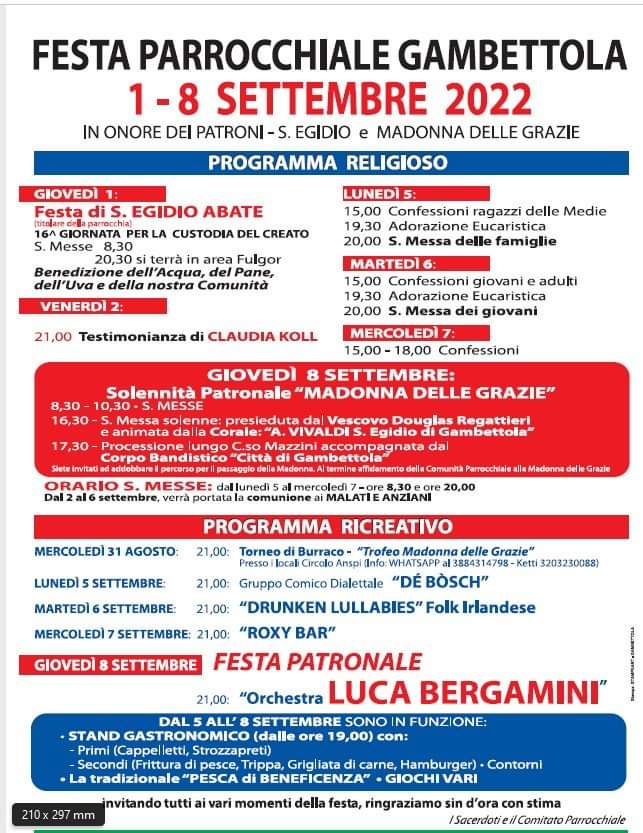 da lunedì 5 a giovedì 8 – Area Parrocchiale di Via Ravaldini: “FESTA DEL PATRONO E DELLA PARROCCHIA” – a cura della Parrocchia di S. Egidio Abate – programma completo: www.parrocchiagambettola.com/eventi/doc/2022-09-01_GA_Festa_Parrocchiale.jpg – info: [email protected]